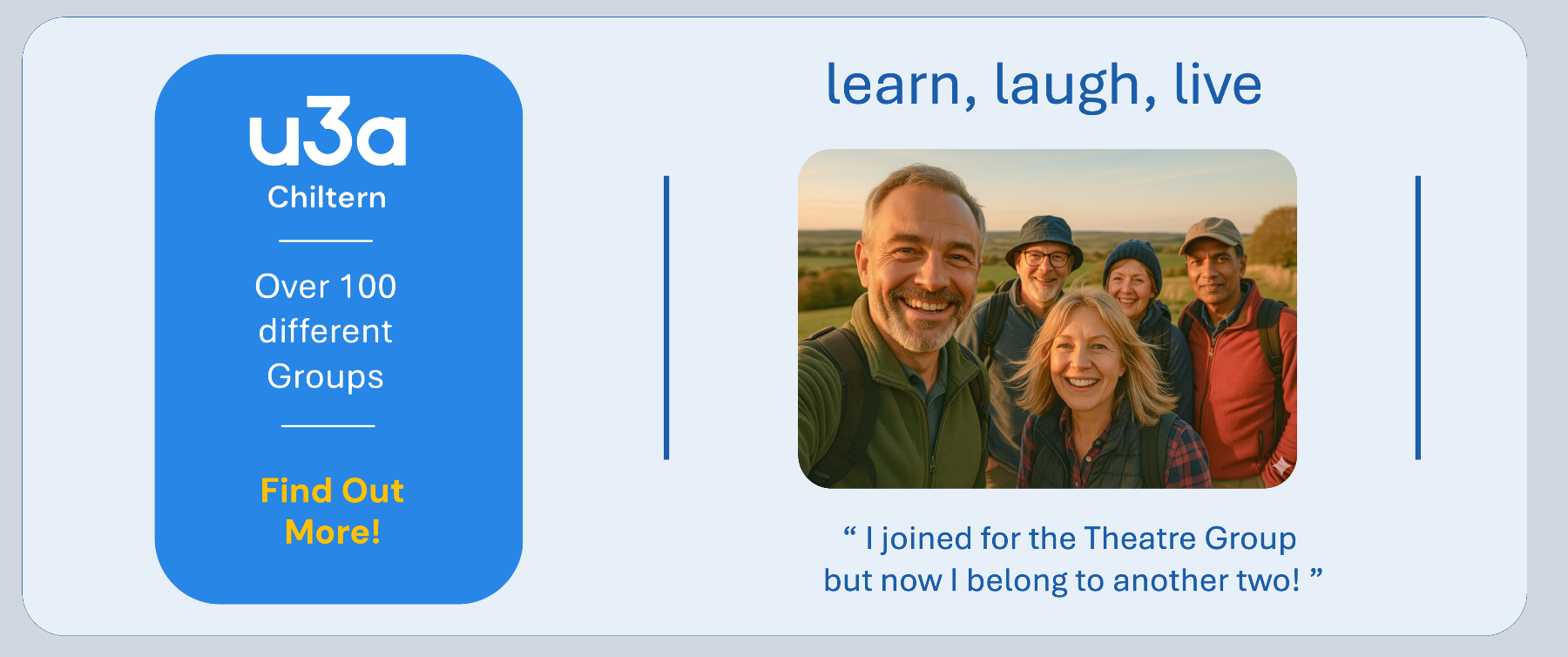 Chiltern u3a (Cu3a) is part of a national network of u3as founded more than 40 years ago. After 26 years of learning, laughing and living in and around the Amersham area, Cu3a is still going strong with around 1550 members and over 100 interest groups.