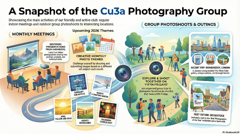 Expert assistance is always available to any Chiltern u3a member at each meeting during tea break but if it involves camera settings then please email us first. Please bring along your Chiltern u3a membership card if it is your first meeting.